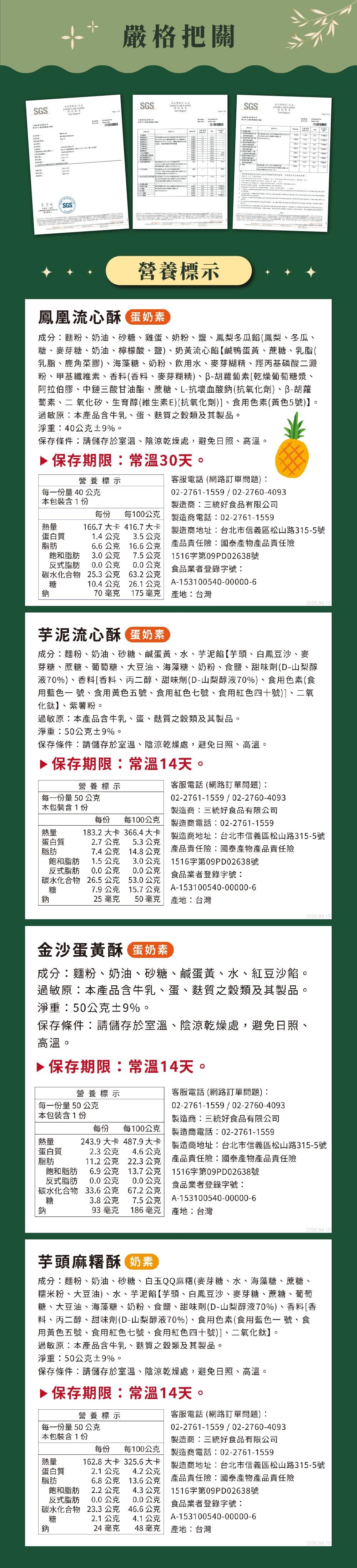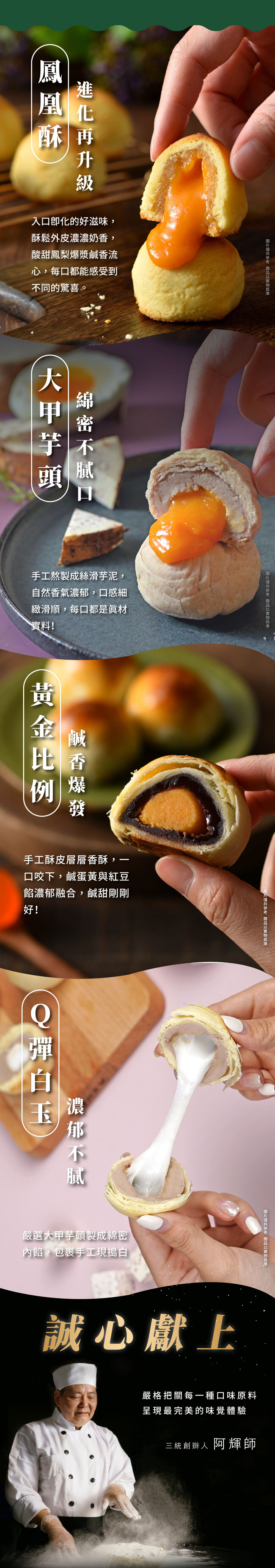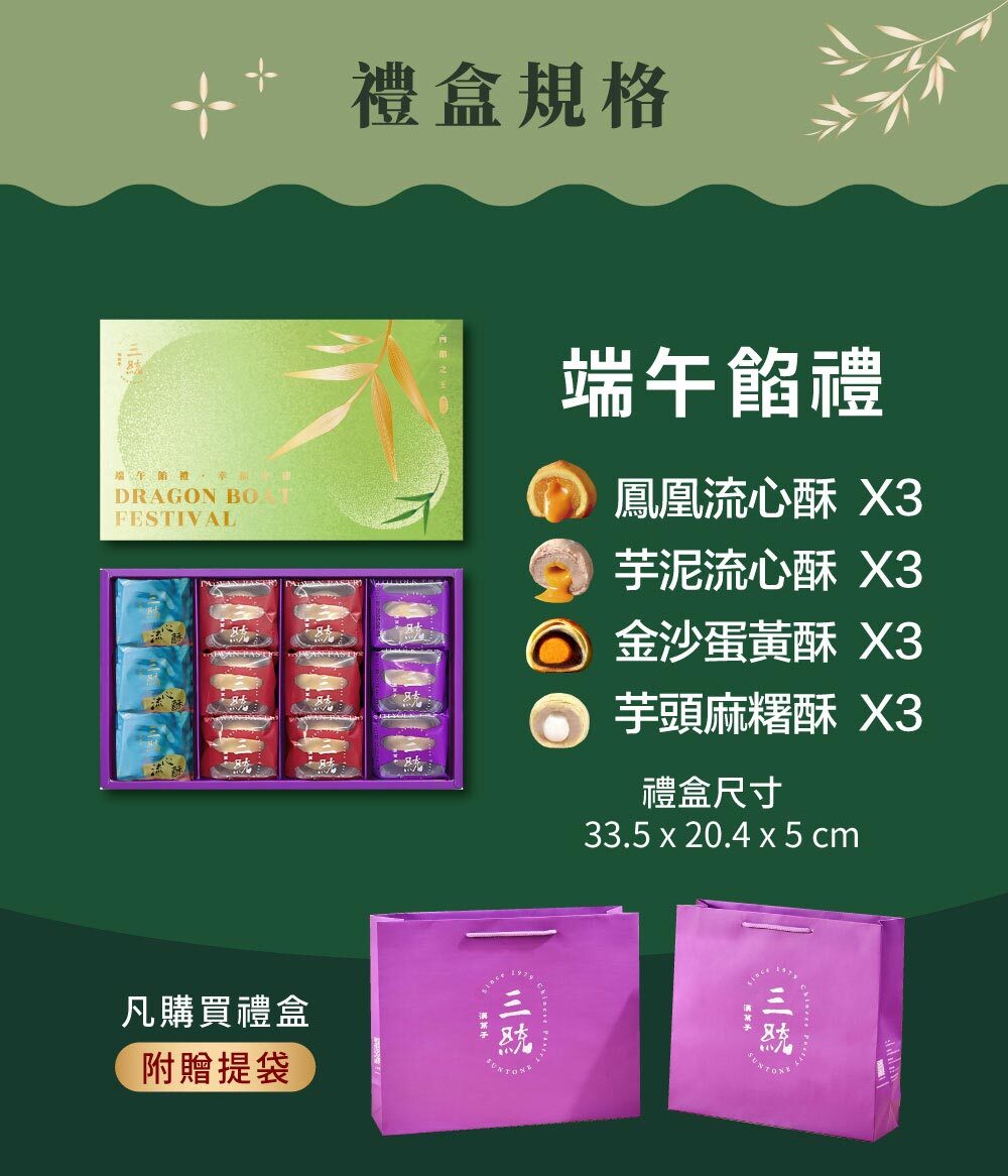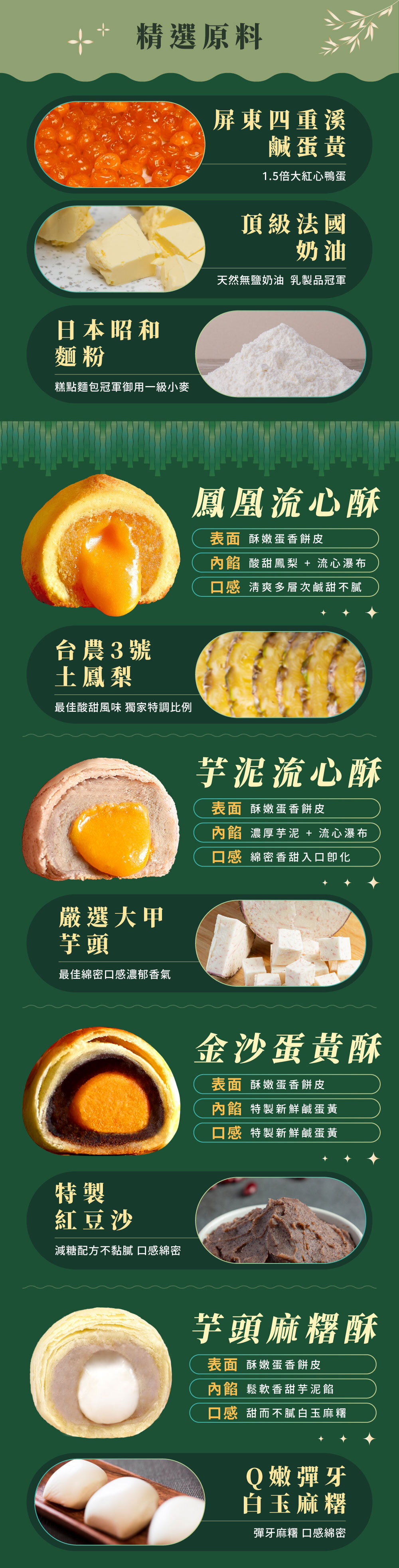 • 內容物:鳳凰流心酥*3+芋泥流心酥*3+金沙蛋黃酥*3+芋頭麻糬酥*3