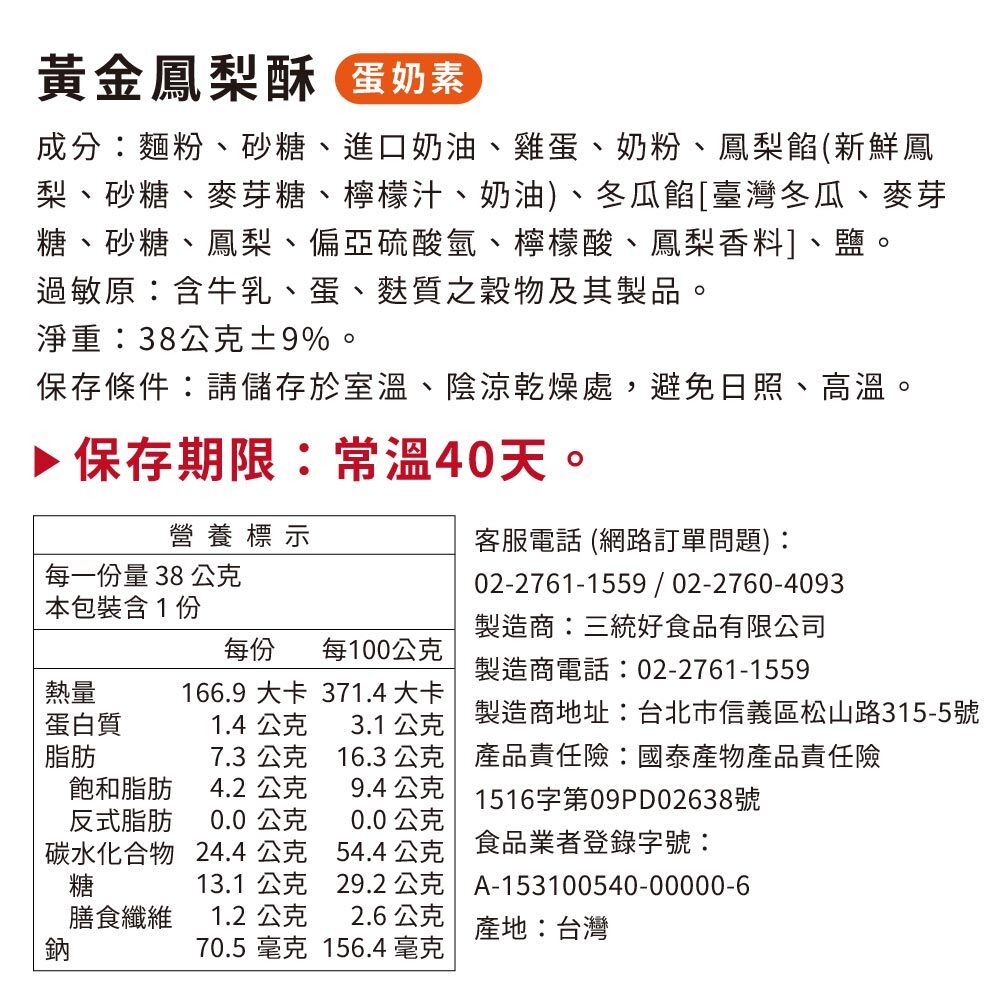 【伴手禮禮盒】台灣伴手禮推薦,也是觀光客指定伴手禮推薦,台北鳳梨酥大賽優勝,金黃蛋液揉合日本頂級麵粉,包入台農金鑽17號土鳳梨與台農3號鳳梨雙搭內餡;超酥的奶香外皮,搭配土鳳梨餡,黃金比例的酸甜組合! 老牌鳳梨酥玩出新花樣,熱銷海外不間斷,是觀光客來台狂掃的伴手禮推薦! 酥脆奶香的外皮,是禮盒熱門茶點推薦,一人一塊感情不散。2025伴手禮禮盒送禮推薦「三統漢菓子 鳳梨酥」,幫您顧及裡子,做足面子!