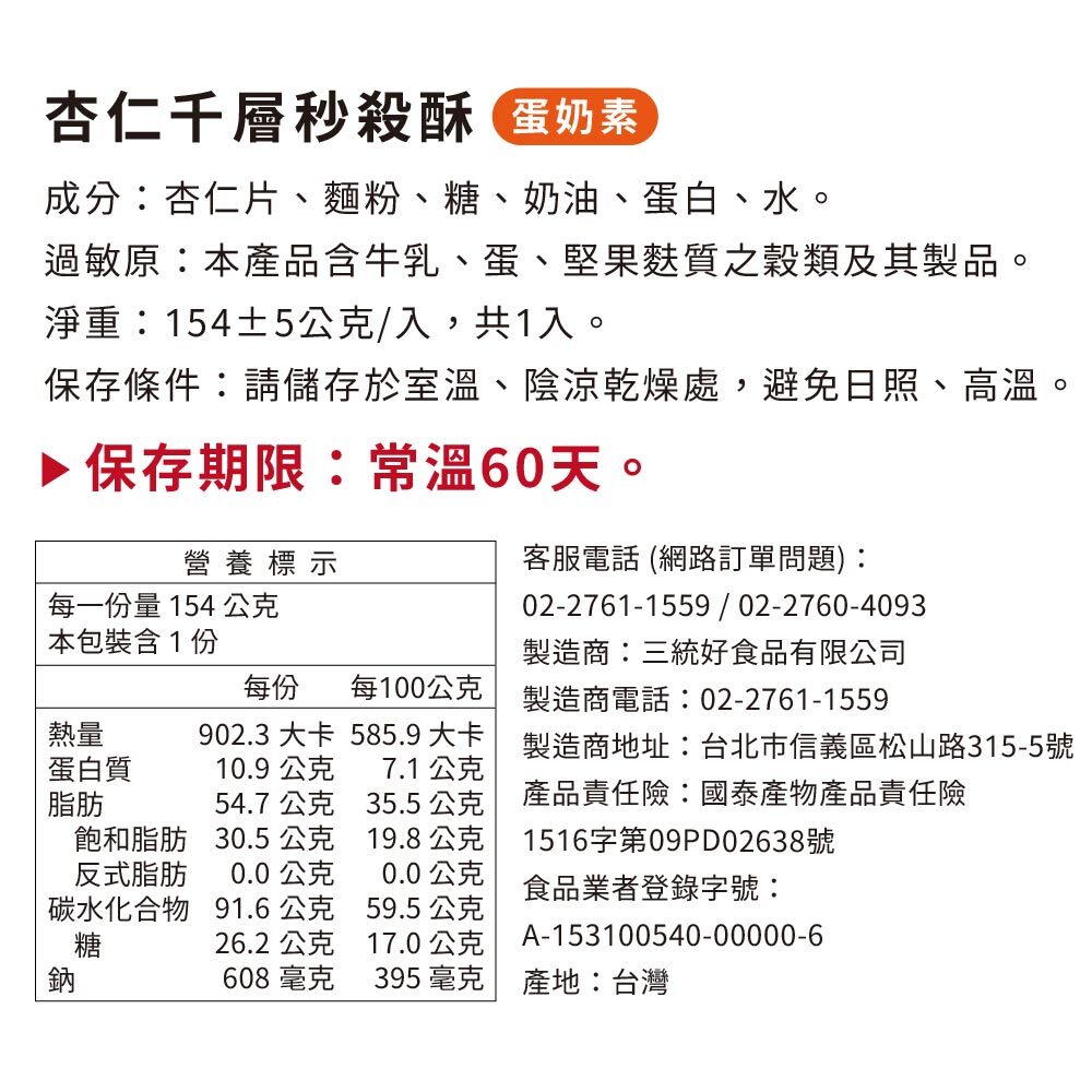 網上團購零食新寵兒!辦公室下午茶王者!三統杏仁千層秒殺酥,酥脆外皮,蓬鬆綿密的豐富內層,濃郁的香氣在口中不斷徘徊,喀滋作響彷彿歷經了千百層的口感體驗,零食推薦補充能量,一口接一口停不下來好味道~