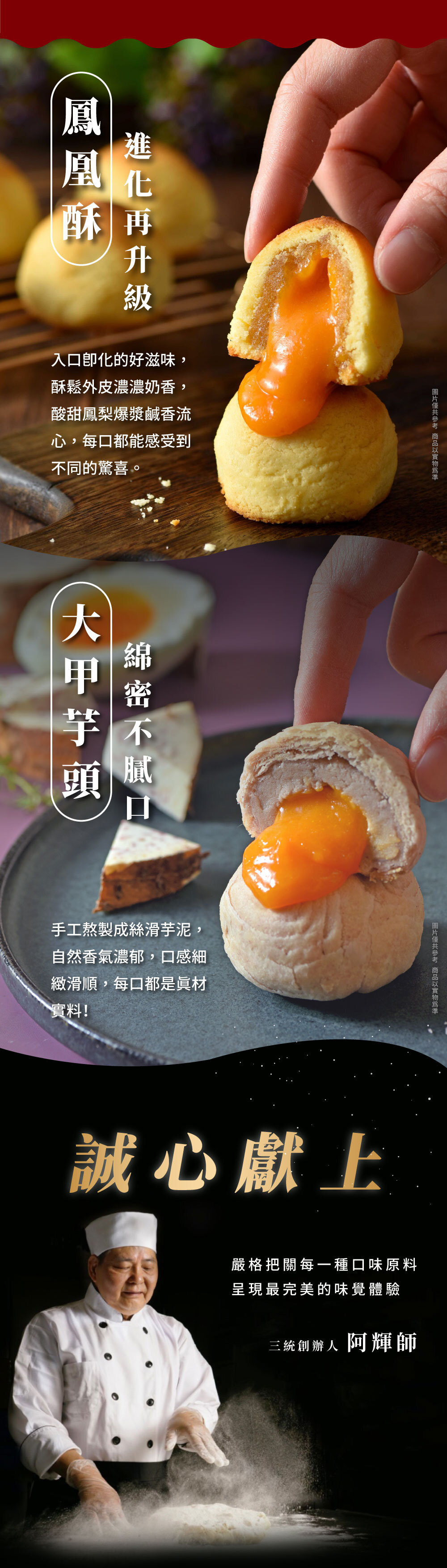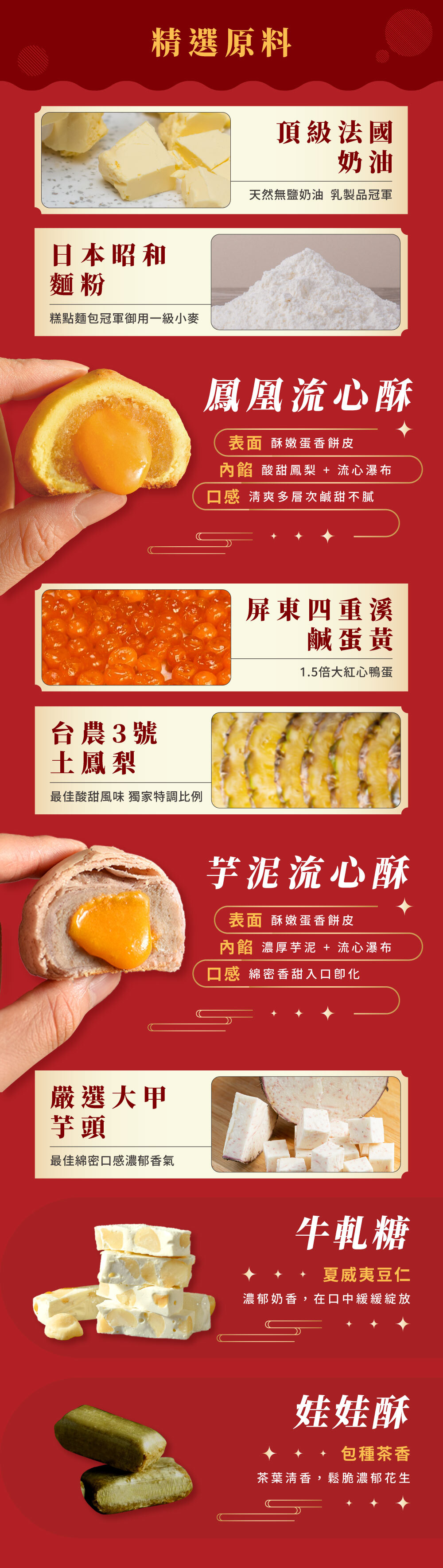 內容物: 鳳凰流心酥*3入+芋泥流心酥*3入+夏威夷豆牛軋糖*15入+包種茶娃娃酥*15入