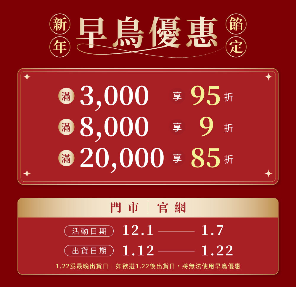 • 【早鳥優惠本島】常溫宅配01/12-01/22可選出貨日(非到貨日),滿$3000免運