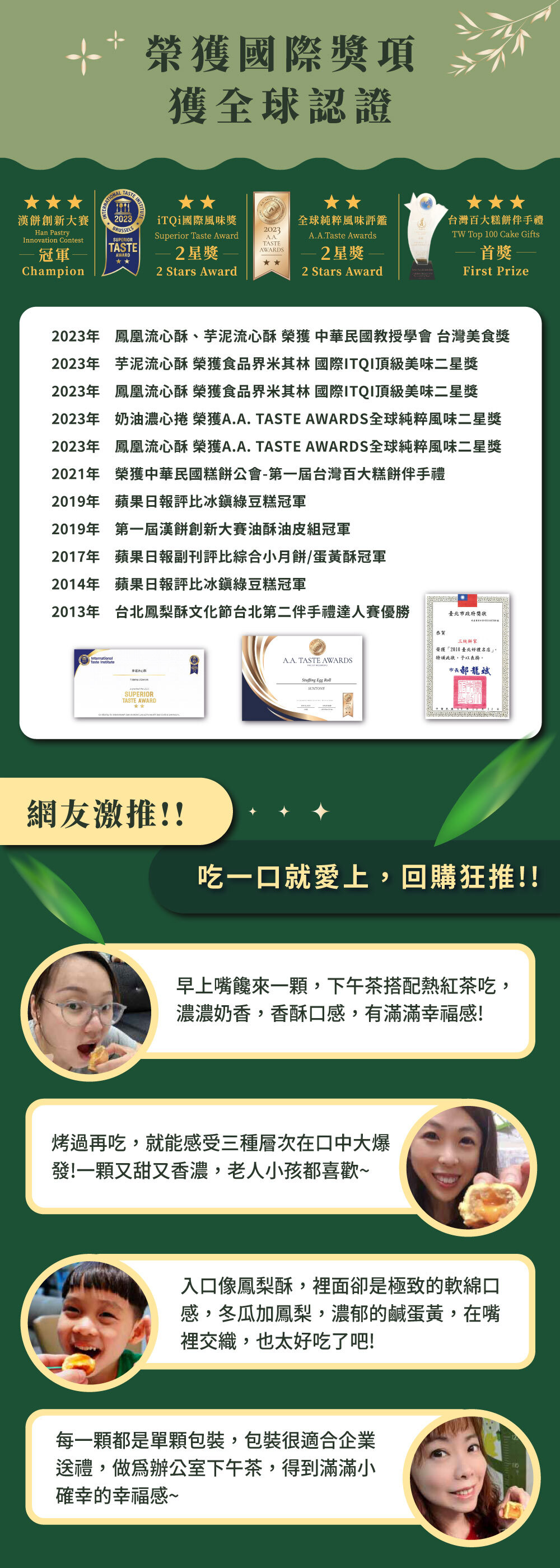 2026端午禮盒推薦,想送出與粽不同的驚喜?【端午餡禮】精選三款人氣甜點,顛覆你對傳統端午的想像!金賞認證「鳳凰流心酥」一口爆漿,蛋香濃郁、鳳梨酸甜爽口;「芋泥流心酥」外層酥香,內餡綿密滑順,鹹甜交織超涮嘴;再搭配層層捲起、茶香濃厚的「抹茶蛋捲」,酥脆不卡喉,每一口都驚豔。時尚綠金包裝,送禮大方,吃得更有質感!今年2025端午禮盒就選這盒