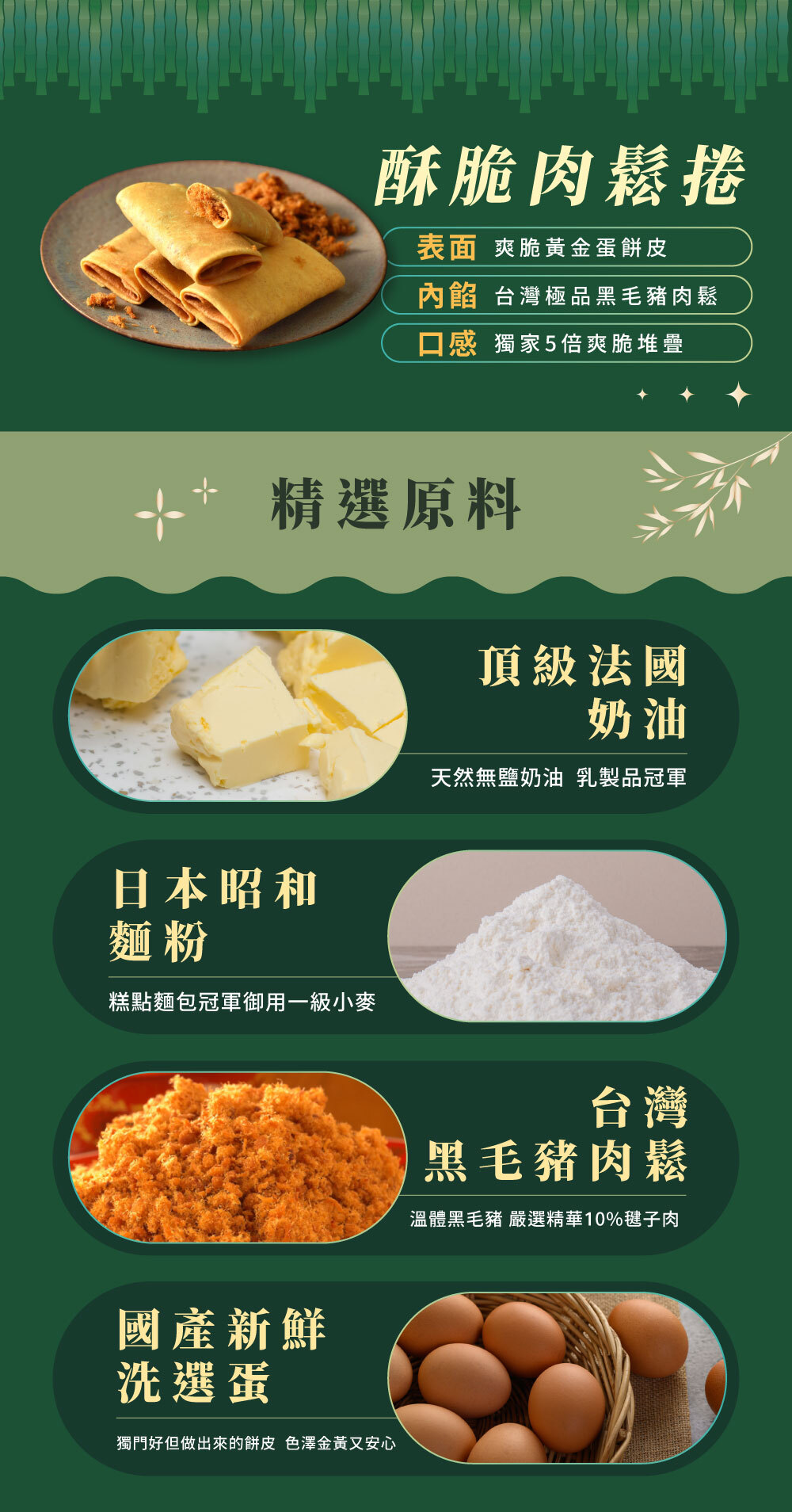 外酥內香,鹹香入魂。嚴選台灣溫體豬後腿肉製成,香氣濃郁的手炒肉鬆,包裹在金黃酥脆的蛋捲中,層層酥香、入口鬆化。每一口都是鹹香與酥脆的完美交織,咀嚼間散發自然肉香與蛋香,鹹而不膩,口感紮實有層次。從原料到製程,堅持無添加、不含人工香料,是讓人安心的經典鹹點首選。這款熱銷商品也成為2025端午禮盒中的人氣品項,在眾多端午禮盒推薦中脫穎而出,為今年端午禮盒注入獨特鹹香風味。