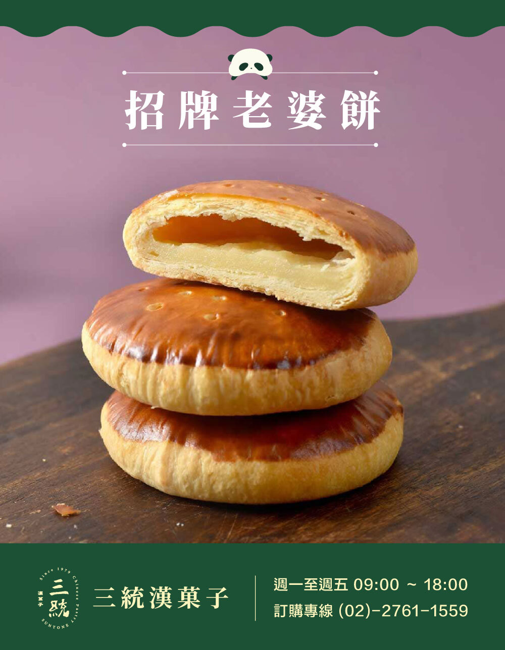 全台第一的老婆餅,熱銷40年好味道,漢餅創新大賽冠軍,茶點推薦第一名,GOOGLE評價4.8顆星,紅遍兩岸伴手禮推薦,明星網紅爭相推薦,下午茶的時光來一壺熱騰騰的茶,搭配外酥內軟的三統老婆餅,不可錯過好選擇,送禮首選「三統老婆餅」,幫您顧及裡子,做足面子!