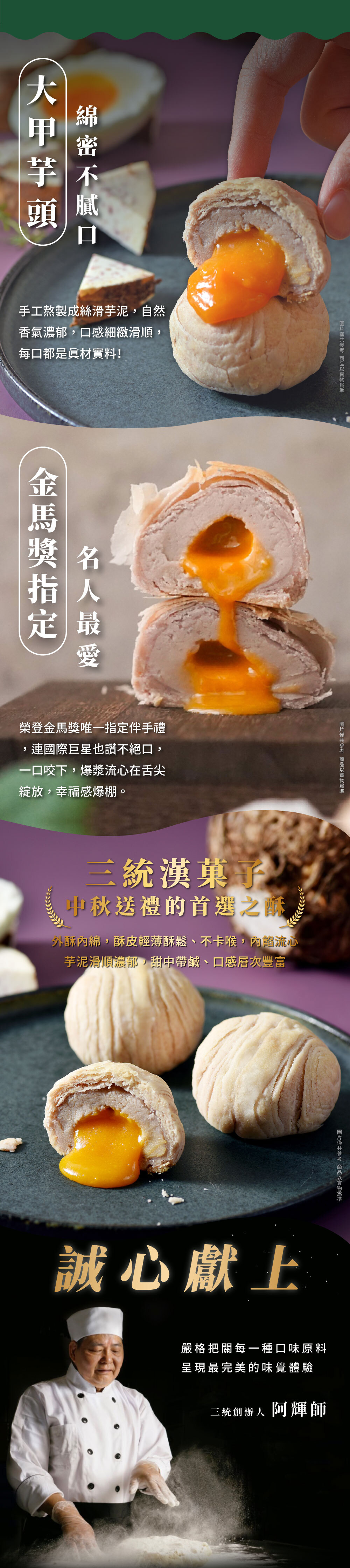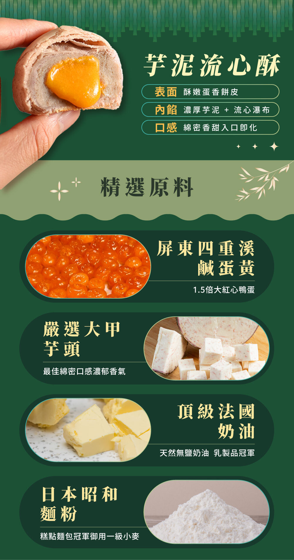 嚴選台灣大甲芋頭製成綿密芋泥,包裹濃郁奶黃流心,一口咬下,香滑內餡瞬間湧出,外皮酥香層次分明,甜而不膩的口感讓人一吃上癮!我們特別將這款美味點心列入2025端午禮盒推薦清單,絕對是送禮自用的最佳選擇!