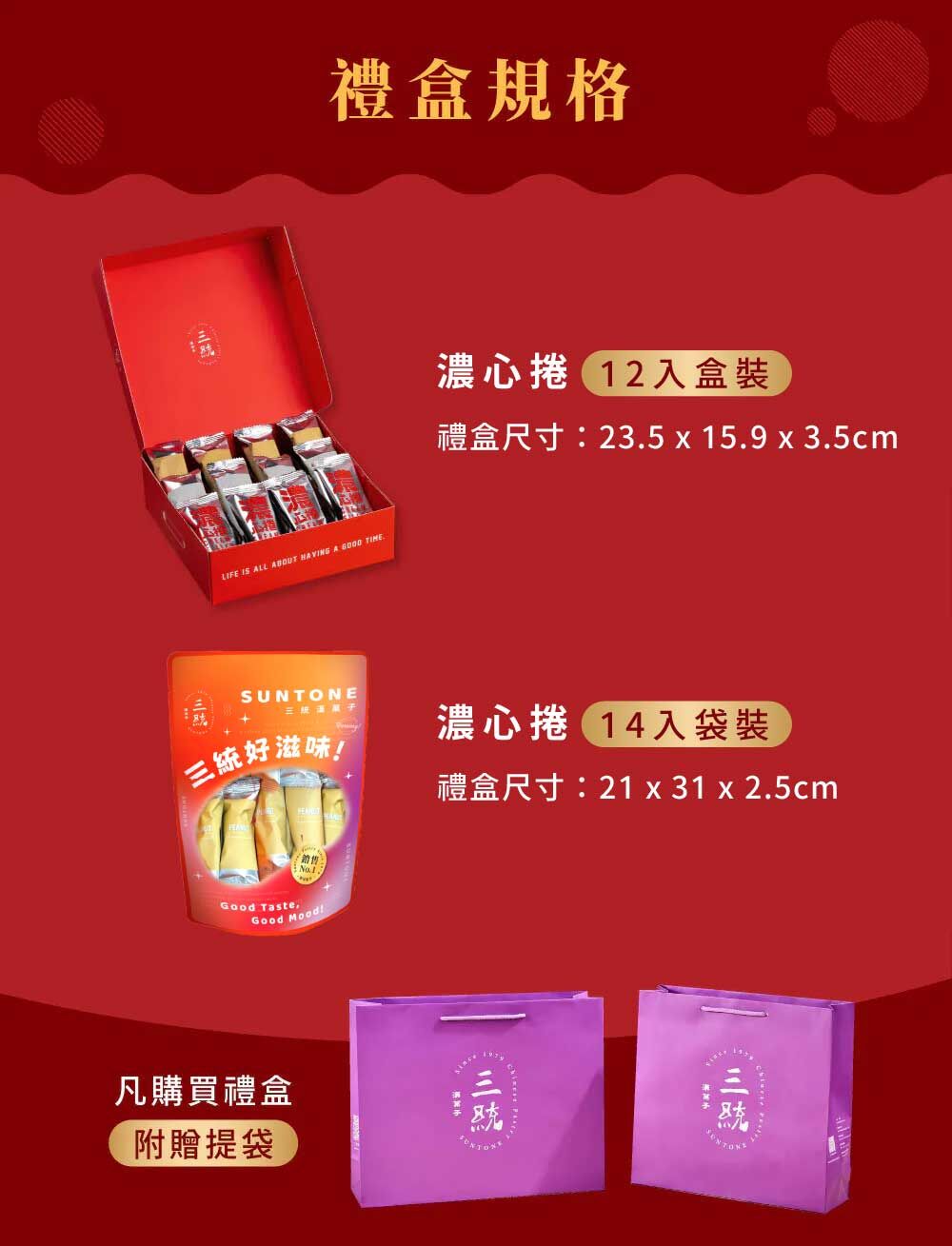 台北40餘年老字號,完美傳承了職人手藝,將漢餅內餡工藝運用在含餡蛋捲的研發上,開發出最適合送禮的含餡蛋捲禮盒:三統濃心捲。三種口味一次滿足,多變口味讓您選擇更多,送禮更好,用料與製程更是細膩絕不馬虎!三統糕餅看似簡單紮實、卻風味深邃,款款均有獨樹一格的醇厚韻味,一掃傳統漢式糕餅的甜膩口感。除了是送禮首選「三統漢菓子」,幫您顧及裡子,做足面子!