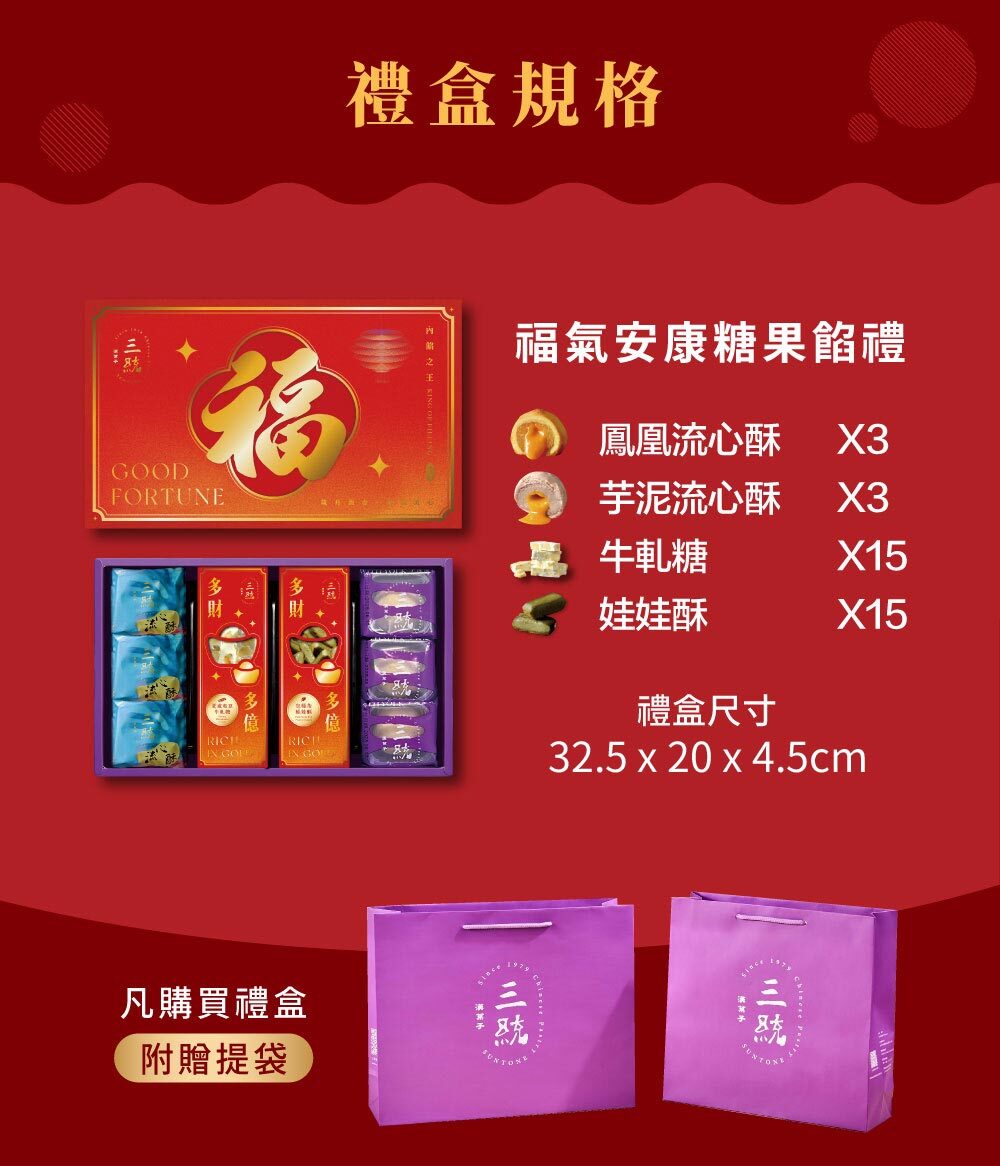 內容物: 鳳凰流心酥*3入+芋泥流心酥*3入+夏威夷豆牛軋糖*15入+包種茶娃娃酥*15入