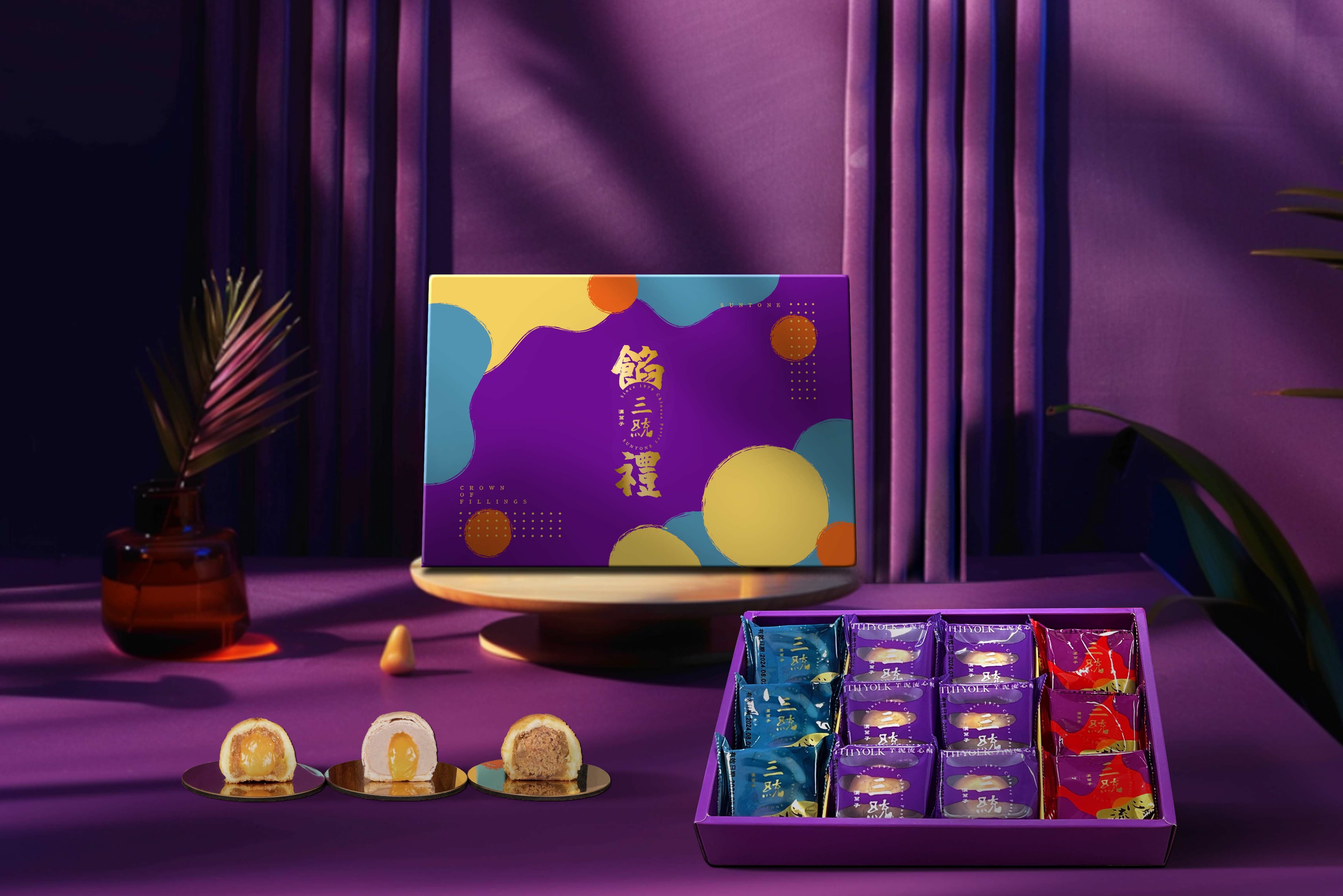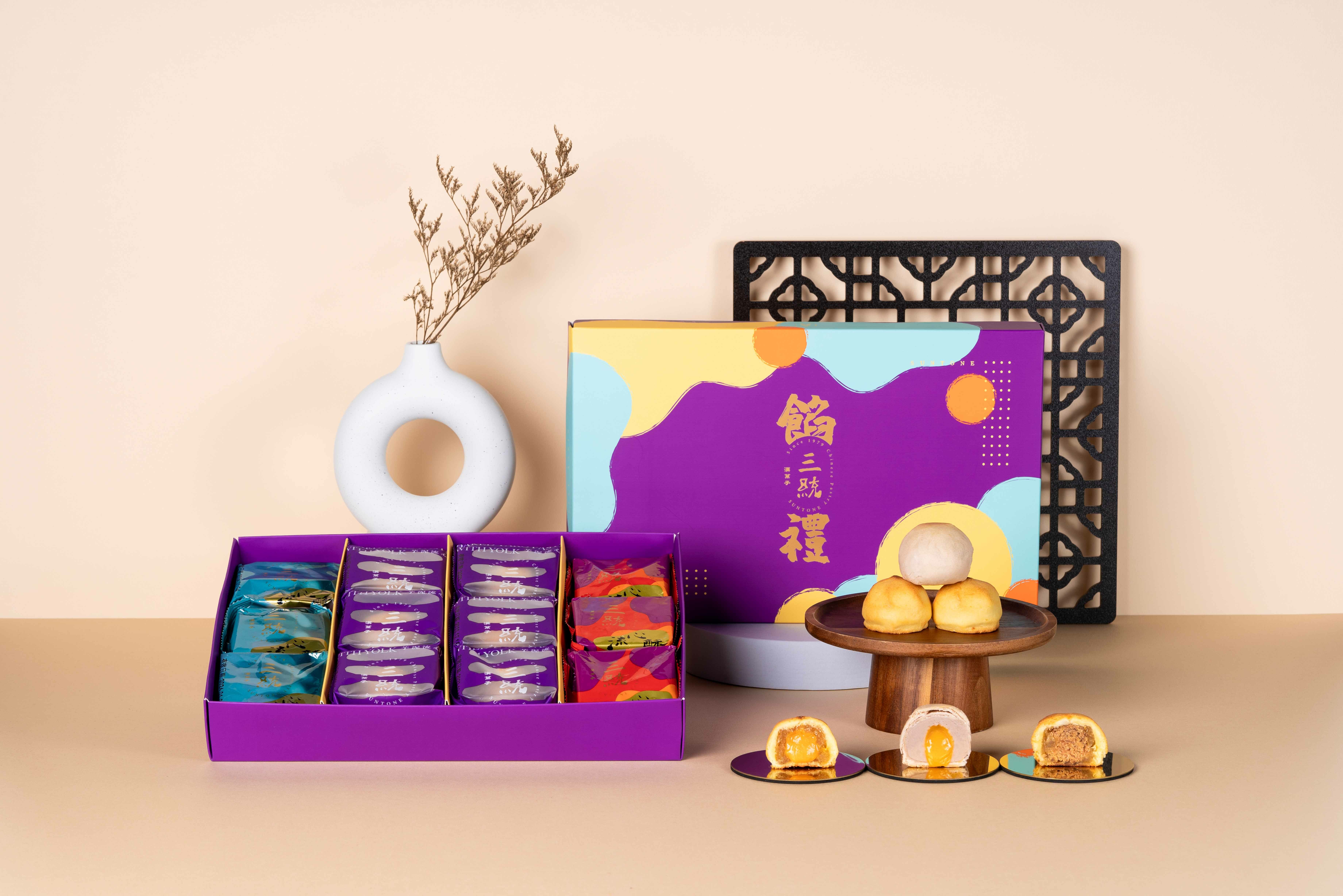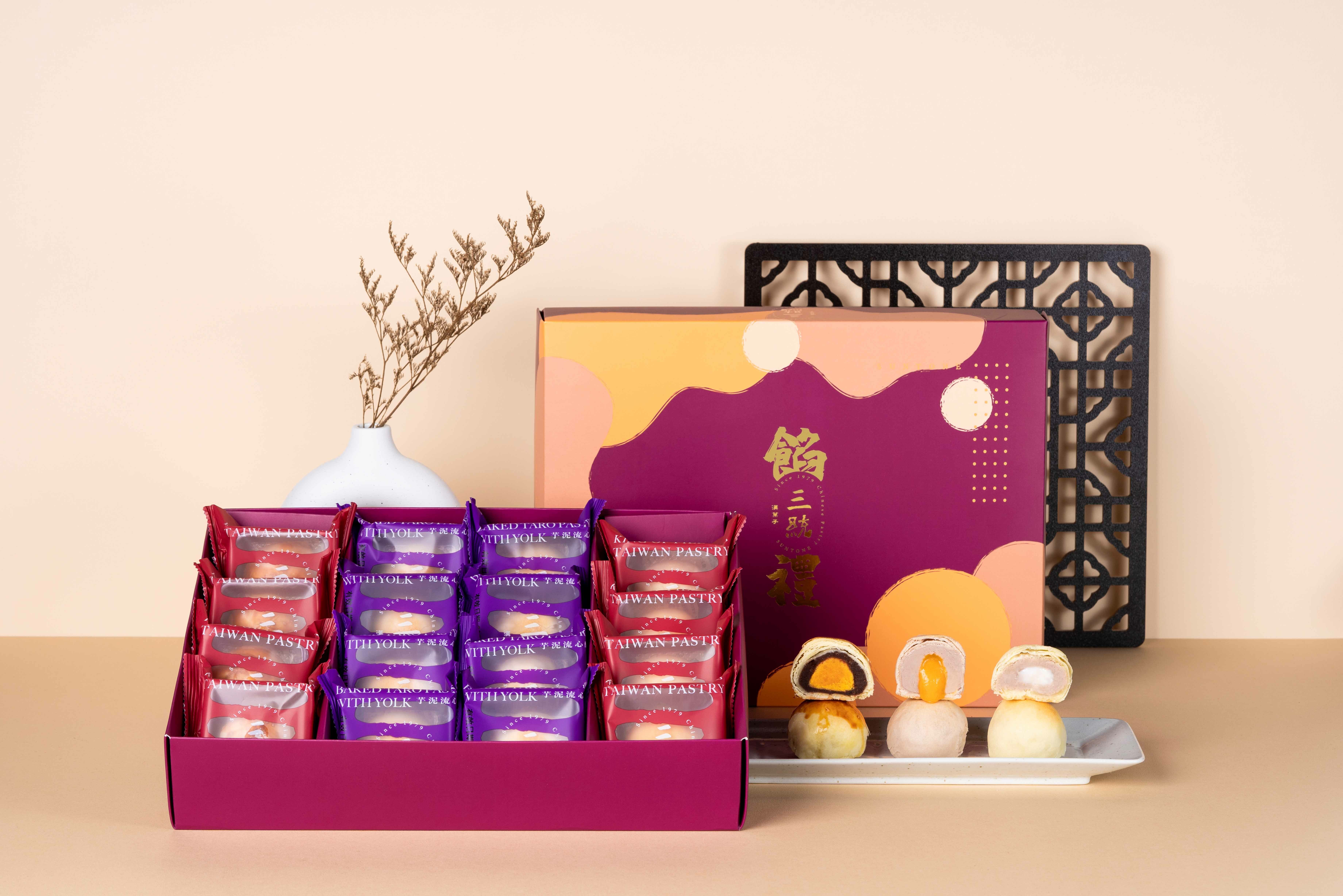 「綜合小月餅」禮盒共有三款三統經典的月餅風味,包含以屏東大紅心鹹蛋黃搭配入口即化的紅豆沙所製成的金沙蛋黃酥、嚴選大甲芋頭製作的芋頭流心酥及芋頭麻糬酥,飽含綿密與Q彈的雙重口感,顛覆味蕾感受,讓本非芋頭控的食客也被深深吸引。