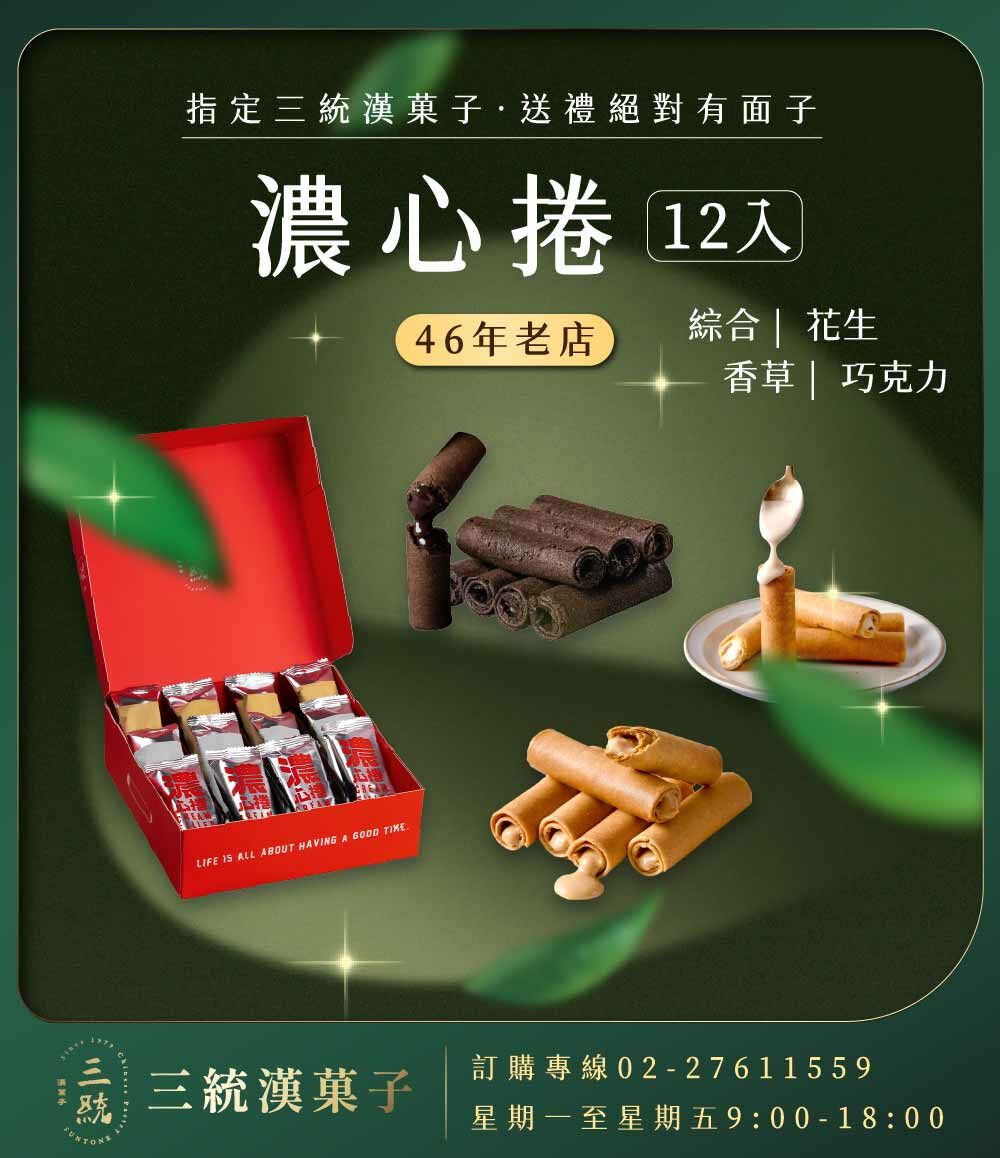 三種經典風味,一次滿足。《綜合濃心捲》集結香濃巧克力、濃郁花生與醇香香草三款人氣口味,外層餅皮輕薄酥脆,內餡綿密細緻、層次分明。巧克力口感濃厚,苦甜平衡;花生香氣飽滿、濃而不膩;香草則散發柔和奶香,帶來自然純粹的甜感。每一口都是細膩的味覺體驗,冷藏後口感更加扎實滑順,是午後時光或節日分享的完美甜點選擇。這款兼具口感與質感的點心,在2025端午禮盒中人氣爆棚,是許多人心中首選的端午禮盒推薦,更是不容錯過的話題端午禮盒之一。