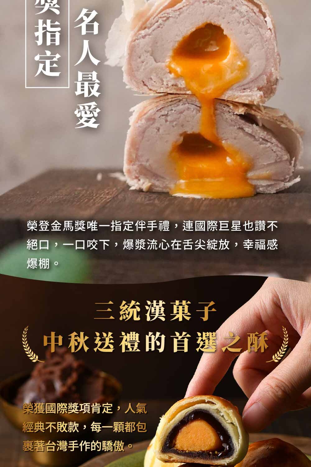 2025中秋禮盒推薦,匯集品牌人氣爆款【中秋禮盒】,一次滿足!酥鬆香濃的「鳳凰流心酥」,鳳梨果香與鹹蛋黃完美融合;綿密鹹甜的「芋泥流心酥」,滑順不膩;經典「金沙蛋黃酥」,酥皮多層、香氣逼人;還有「芋頭麻糬酥」Q彈麻糬搭配細緻芋泥,口感超療癒!三統榮獲全球50大獎肯定,熱銷突破500座101