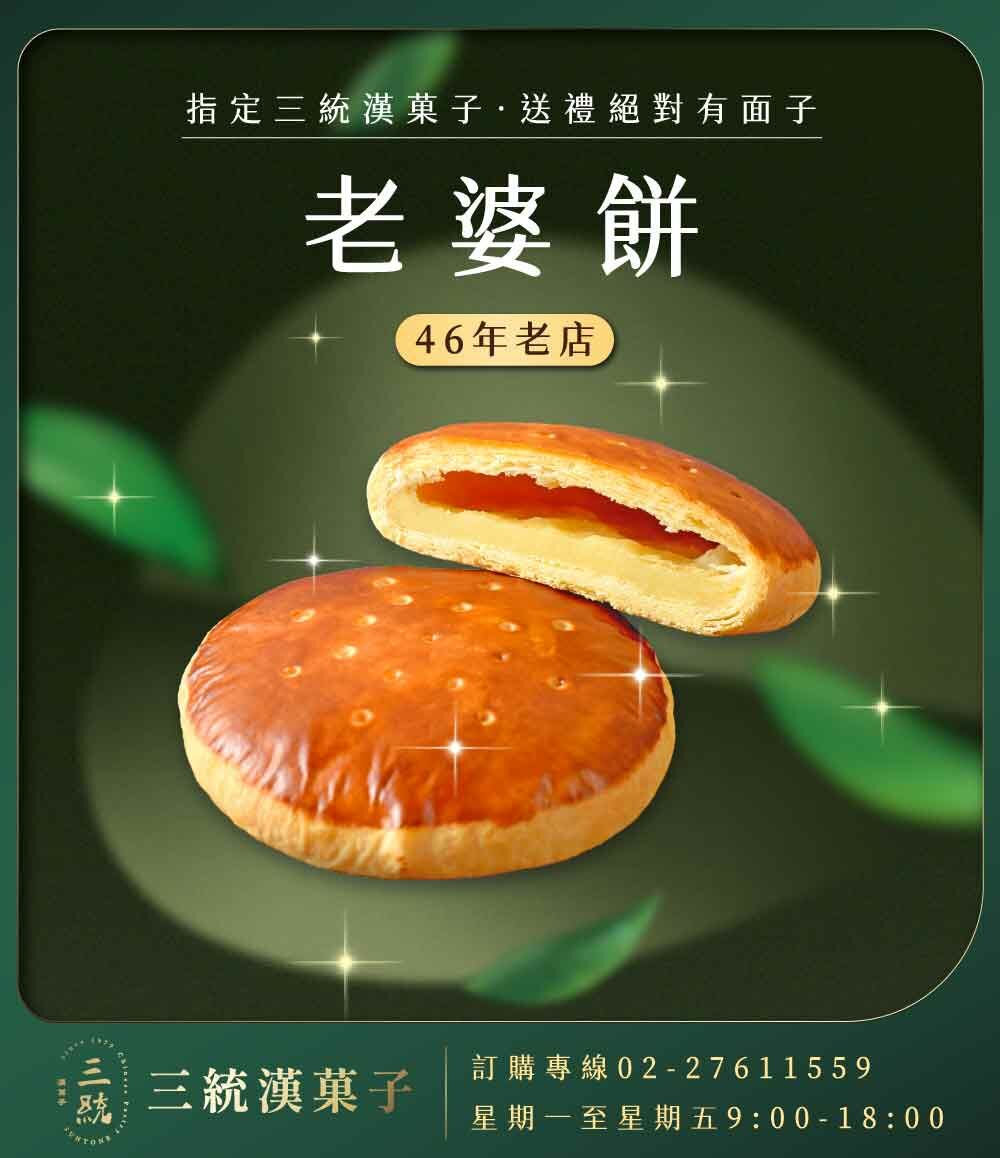 全台第一的老婆餅,熱銷40年好味道,漢餅創新大賽冠軍,茶點推薦第一名,GOOGLE評價4.8顆星,紅遍兩岸伴手禮推薦,明星網紅爭相推薦,下午茶的時光來一壺熱騰騰的茶,搭配外酥內軟的三統老婆餅,不可錯過好選擇,送禮首選「三統老婆餅」,幫您顧及裡子,做足面子!