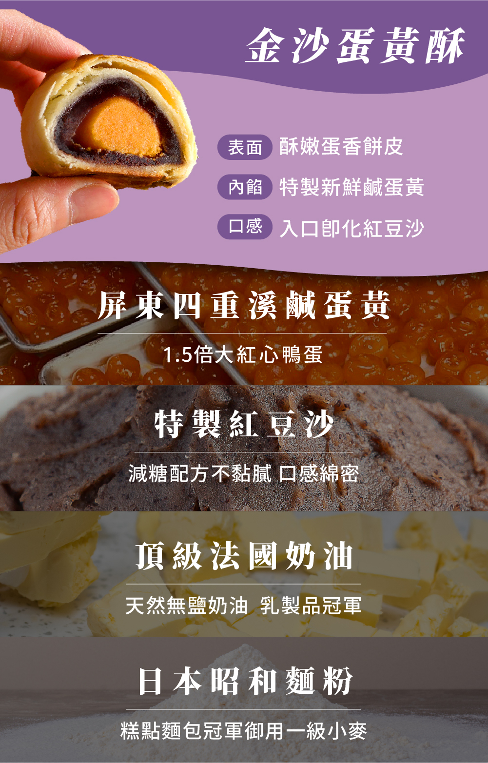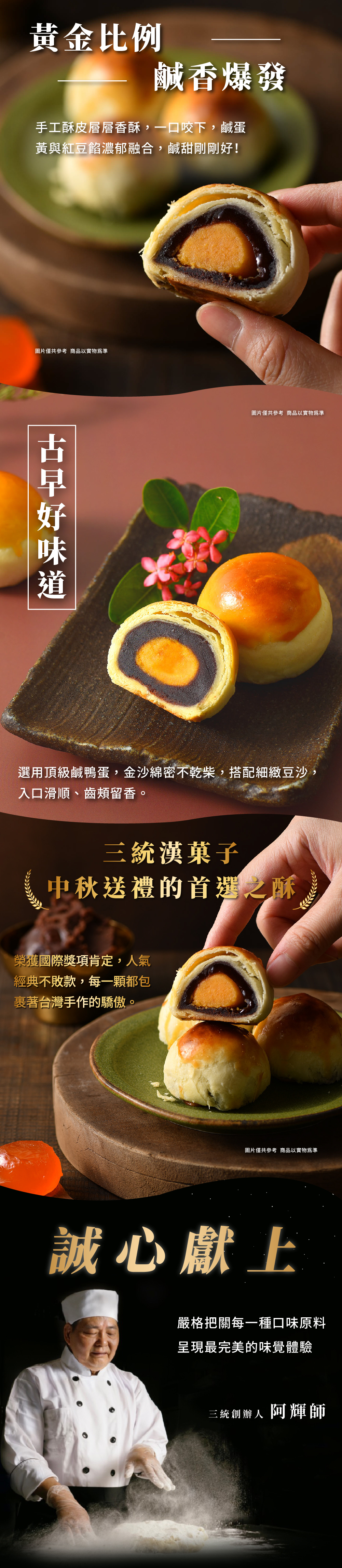 2025中秋禮盒推薦,選用屏東小農四重溪鹹蛋黃,1.5倍大紅心鹹鴨蛋,口感鹹香綿密,搭配入綿密紅豆沙,讓人一口也停不下來!中秋禮盒推薦「三統漢菓子 金沙蛋黃酥」,外皮口感酥鬆多層次,扎實不掉屑。什麼美味秘訣?這就材料大公開,嚴選世界糕餅冠軍愛用麵粉、日本銷售第一的白砂糖,清甜不膩口,核心味蕾來自屏東大紅心鹹蛋黃,口感豐富讓你吃了一口就愛上,中秋賞月的中秋禮盒好朋友,就選「三統漢菓子 金沙蛋黃酥」