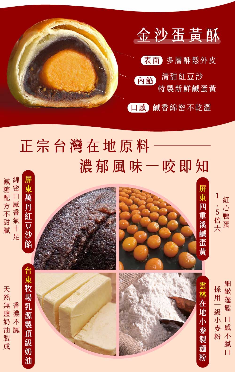 三統金沙蛋黃酥材料大公開!嚴選世界糕餅冠軍愛用麵粉,烤出來餅皮酥鬆有層次,內餡搭配不黏口的紅豆沙,使用日本銷售第一的白砂糖,清甜不膩口,核心來自屏東大紅心鹹蛋黃,豐富的口感讓你吃了一口就愛上!辦公室茶點推薦,出差拜訪親戚伴手禮推薦,送禮送到心坎裡~~