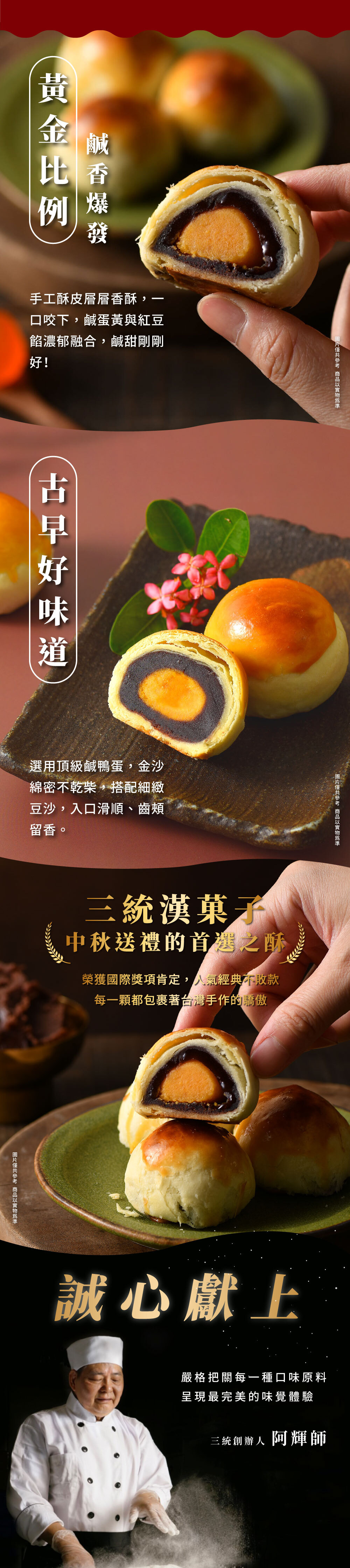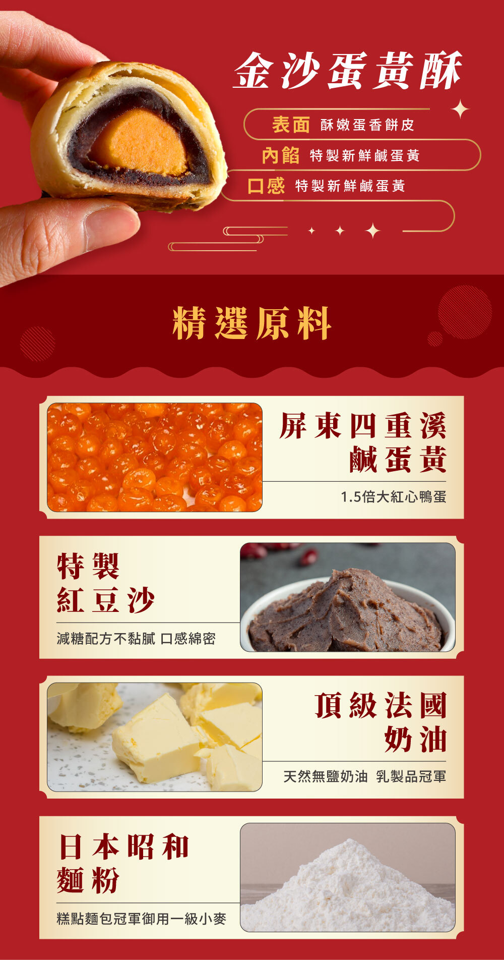 三統金沙蛋黃酥材料大公開!嚴選世界糕餅冠軍愛用麵粉,烤出來餅皮酥鬆有層次,內餡搭配不黏口的紅豆沙,使用日本銷售第一的白砂糖,清甜不膩口,核心來自屏東大紅心鹹蛋黃,豐富的口感讓你吃了一口就愛上!辦公室茶點推薦,出差拜訪親戚伴手禮推薦,送禮送到心坎裡~~