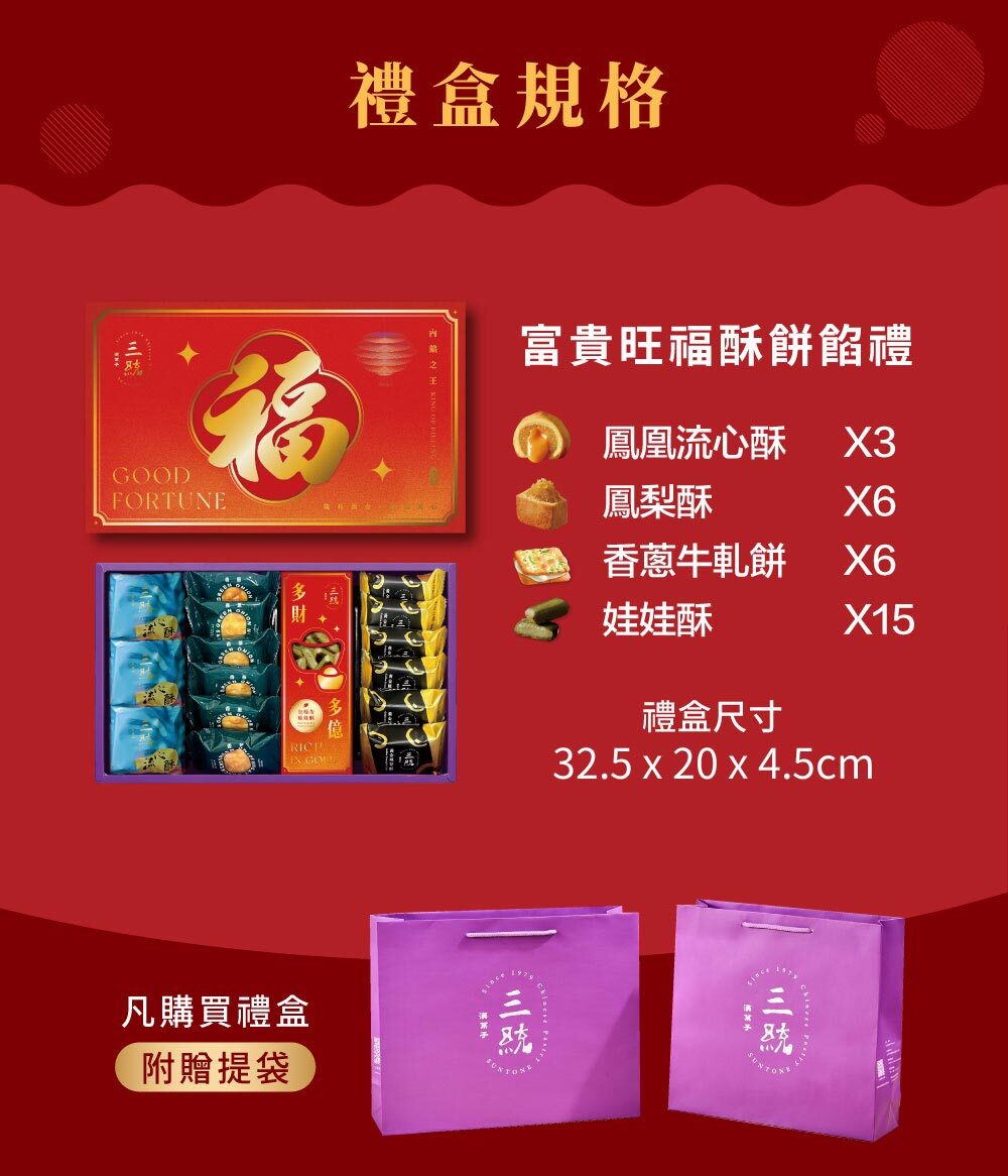 內容物:鳳凰流心酥*3入+鳳梨酥*6入+香蔥牛軋餅*6入+包種茶娃娃酥*15入