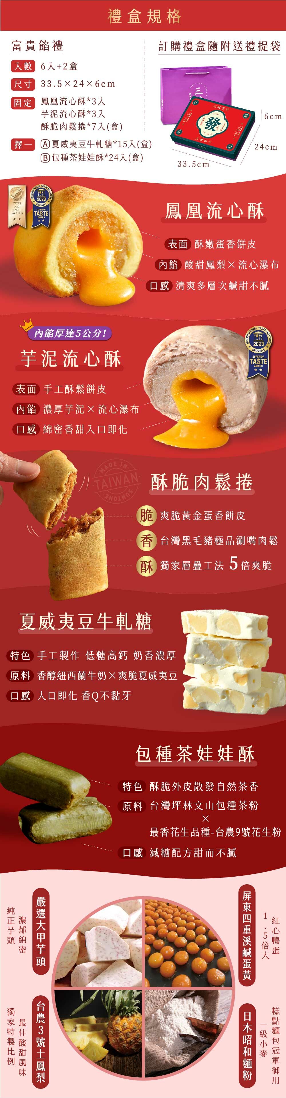 內容物:鳳凰流心酥*3入+鳳梨酥*6入+牛軋餅*6入+娃娃酥*15入
