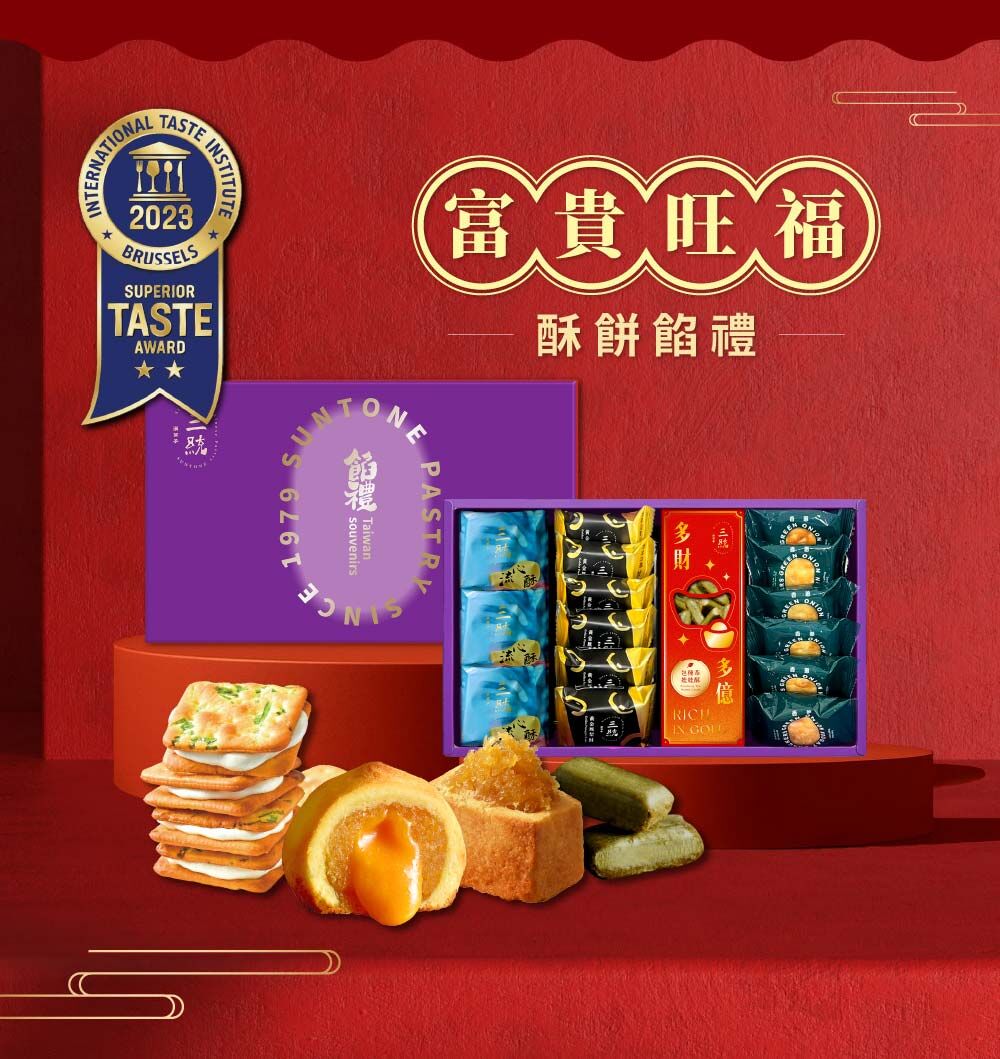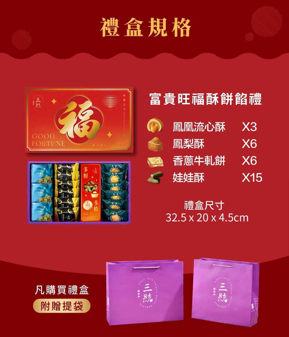 內容物:鳳凰流心酥*3入+鳳梨酥*6入+香蔥牛軋餅*6入+包種茶娃娃酥*15入