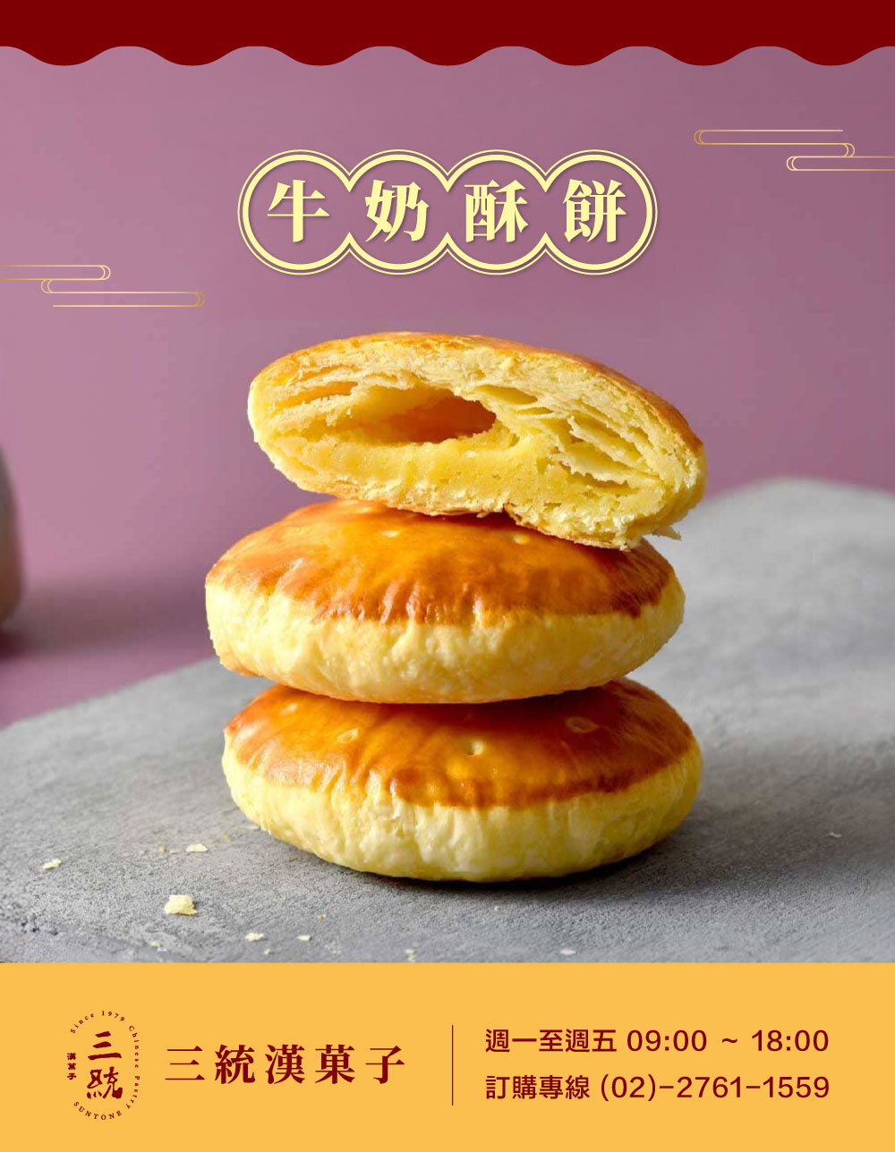內餡香軟細緻、外皮酥鬆,濃濃奶香在嘴裡蔓延開來,停不下來的下午茶點心,辦公室零食團購必備,伴手禮推薦「三統牛奶酥餅」現做現吃最新鮮,不含防腐劑,包裝大氣,顧及裡子,送禮最有面子!