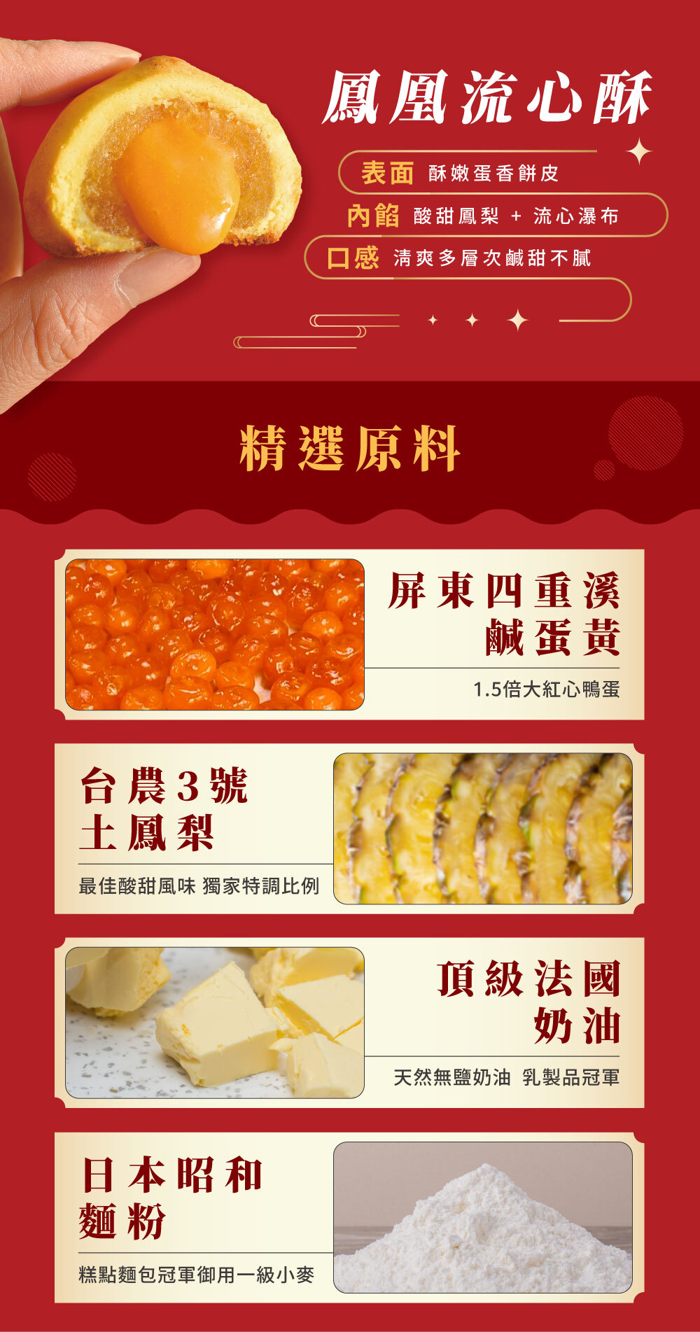 流心月餅大熱門!一生必嚐的「鳳凰流心酥」,超越香港美心的評價,就算排隊也要吃到; 40幾年職人手工技藝,加上頂級特選食材; 酥鬆餅皮,包裹綿密獨製的蛋黃流沙內餡,鹹甜不膩的口感,包證你一吃就愛上!黃金比例的鹹甜美味,濃郁又多層次的口感,一口讓你擁有三種感受:酥脆➔綿密➔爆漿