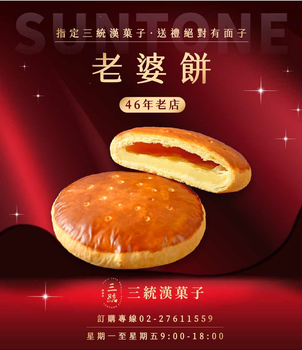 全台第一的老婆餅,熱銷40年好味道,漢餅創新大賽冠軍,茶點推薦第一名,GOOGLE評價4.8顆星,紅遍兩岸伴手禮推薦,明星網紅爭相推薦,下午茶的時光來一壺熱騰騰的茶,搭配外酥內軟的三統老婆餅,不可錯過好選擇,送禮首選「三統老婆餅」,幫您顧及裡子,做足面子!