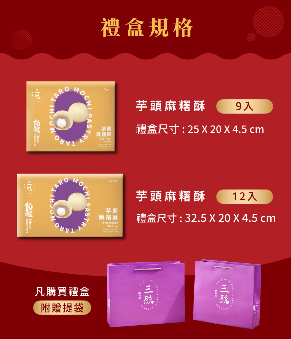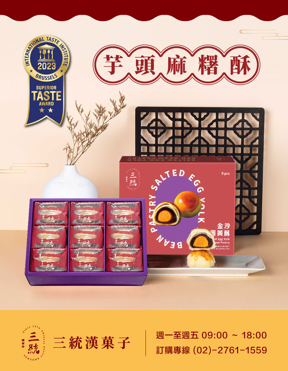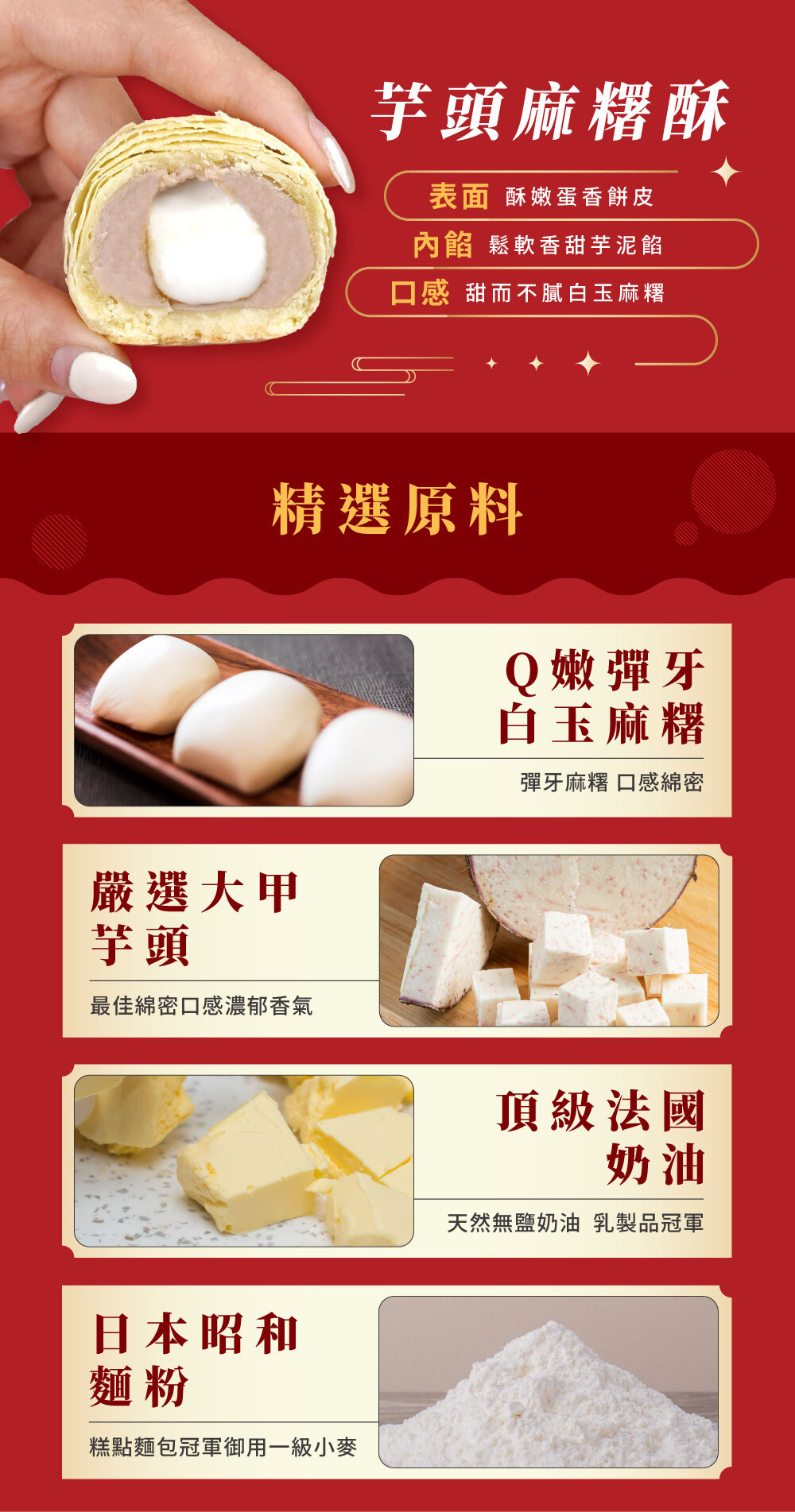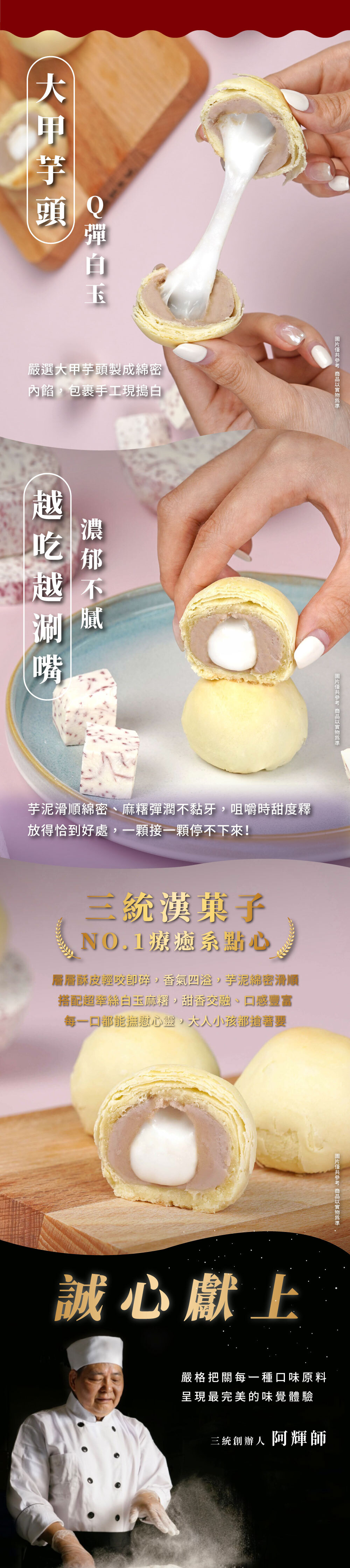使用三統經典芋泥餡,嚴選大甲產地芋頭製作,內餡綿密香甜,散發出抵擋不住的芋頭香,內餡再搭配Q嫩彈牙的白玉麻糬,不乾不噎口,細緻口感令人難以忘懷,不是芋頭控也會深陷的一款美味糕點~