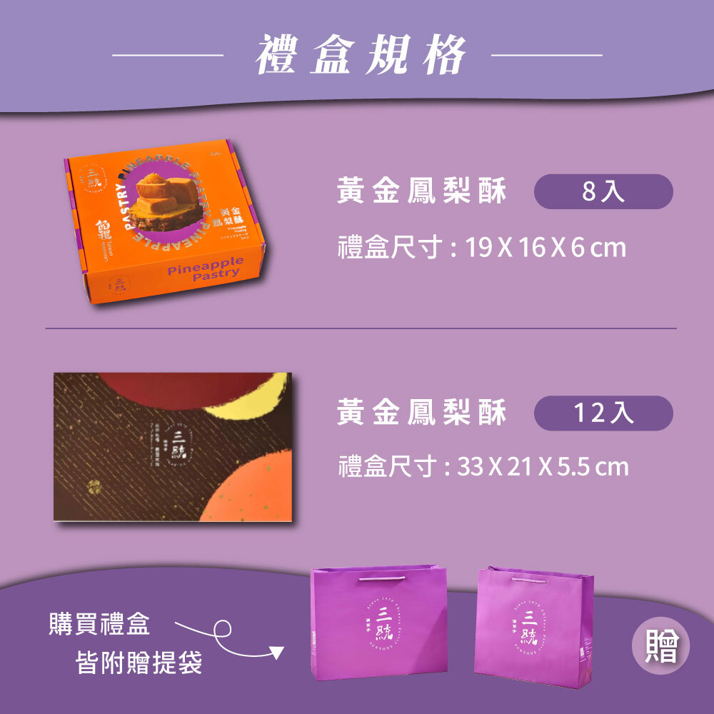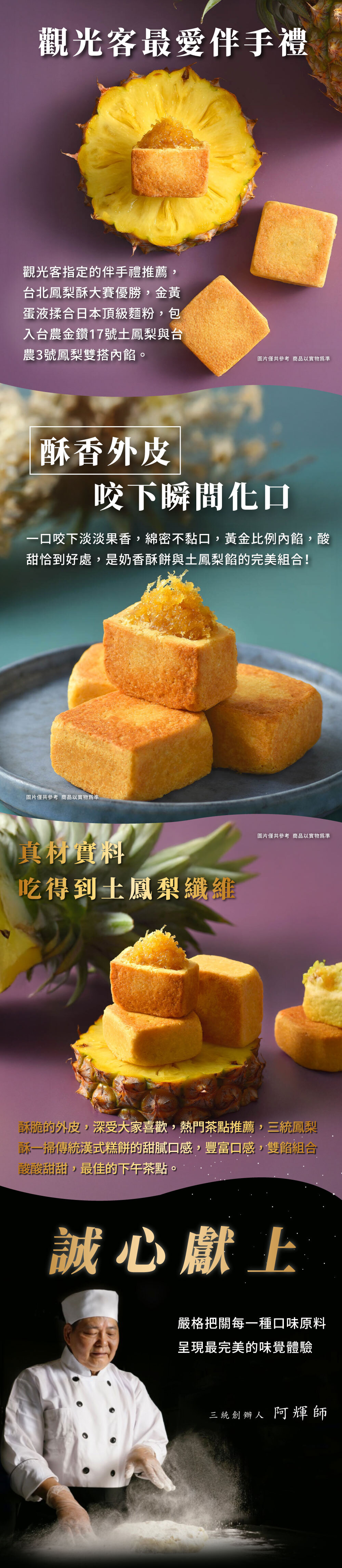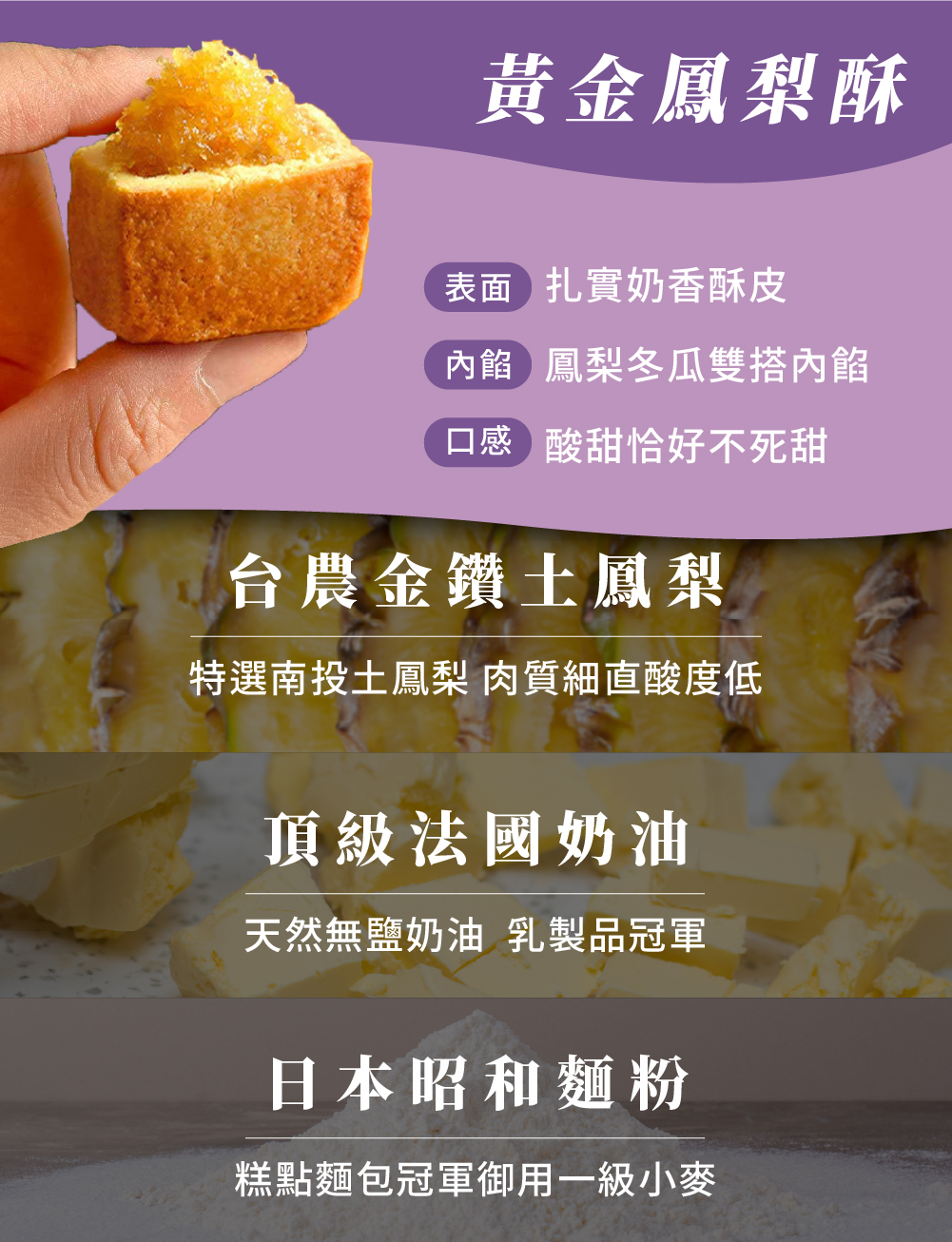 觀光客指定的伴手禮推薦,台北鳳梨酥大賽優勝,金黃蛋液揉合日本頂級麵粉,包入台農金鑽17號土鳳梨與台農3號鳳梨雙搭內餡;外皮超酥,神奇滋味不死甜,黃金比例內餡,酸甜恰到好處,是奶香酥餅與土鳳梨餡的完美組合!