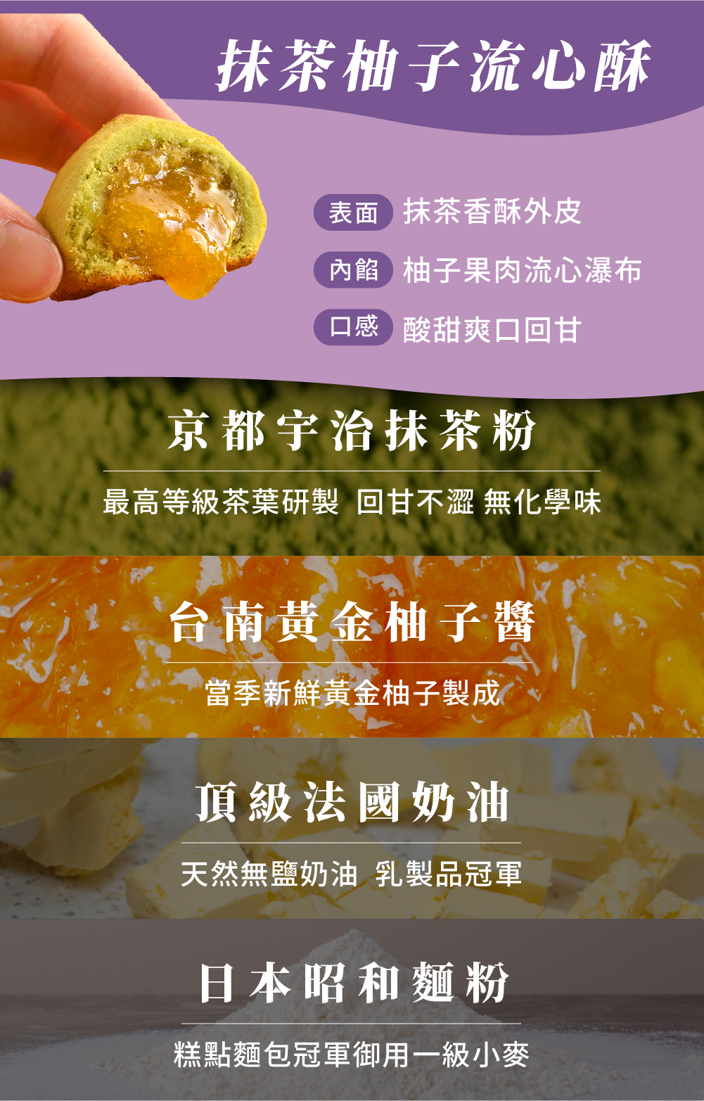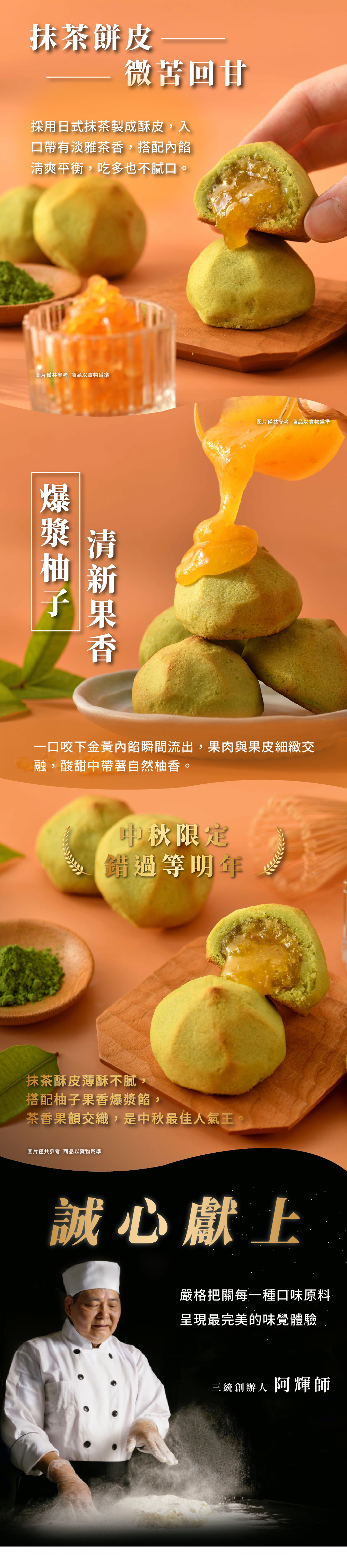 嚴選進口奶油製作,外皮加入綠色抹茶粉,健康無負擔,一口咬下,鳳梨內餡在口中化開香濃的柚子香立即四散開來,柚香爽口,口感香酥,內餡酸甜而不膩,堅持手工製造且無添加物的產品是我們的文化,讓大家都能品嚐到最美味最天然的滋味,絕對是佳節必備伴手禮推薦,團聚你我的心。企業送禮、辦公室團購美食、自用首選中秋禮盒!中秋烤肉不能錯過的好味道,快與你愛吃柚子的親朋好友分享吧!