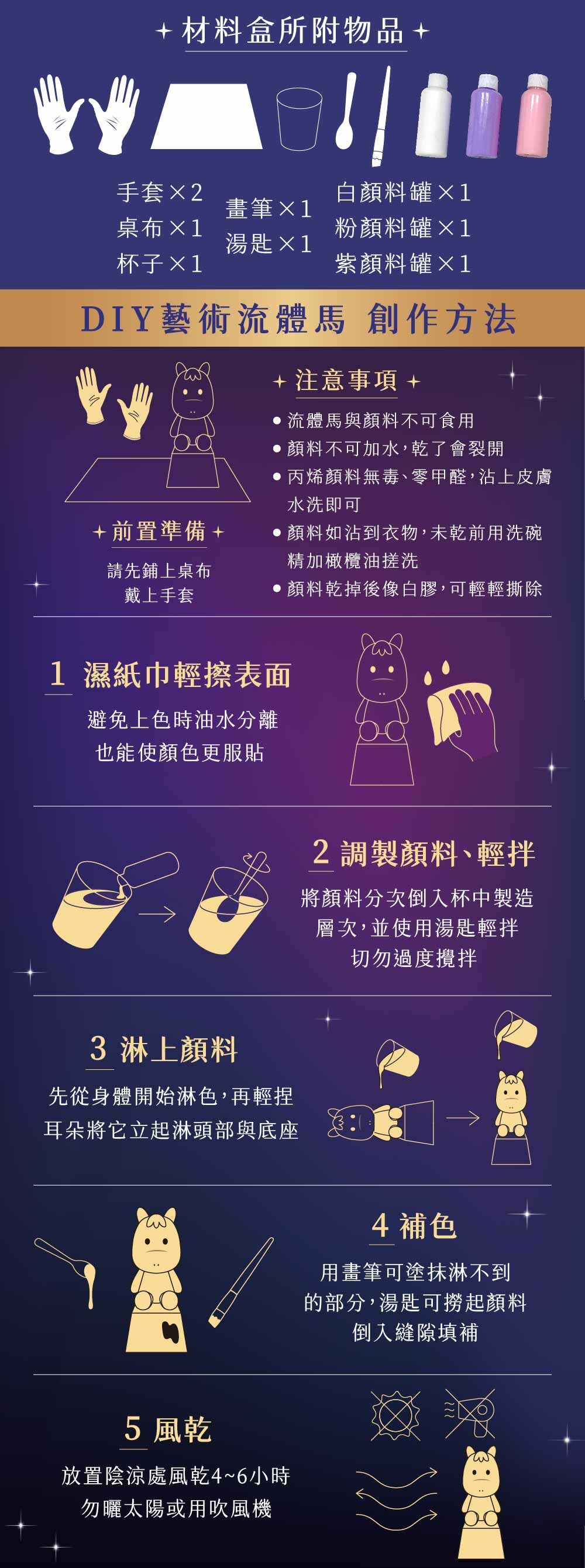 3.材料盒*1盒 (手套×2桌布×1杯子×1畫筆×1湯匙×1白/粉/紫顏料×各1)